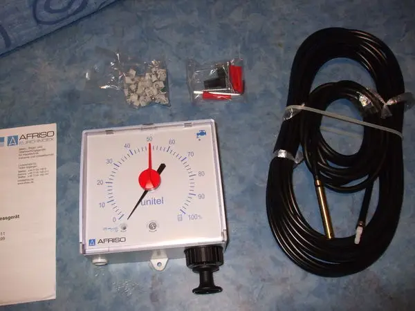 Modèle pneumatique en set complet, 3.10m sonde citerne, 10 m de conduite sonde / boitier, rallonge de 10 m possible. Affichage aiguille en %, de 0 à 100 %. Facile à poser. Notice.